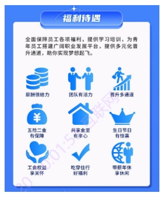 薪酬很给力、团队有活力、晋升多通道、五险二金有保障、共享金里有孝心、生日节日有惊喜、工会权益享关情、吃穿住行好福利、带薪年休享休闲